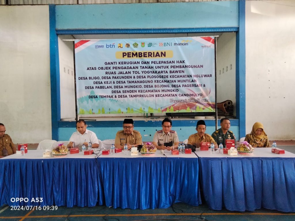 DELIK-HUKUM.ID ( MAGELANG ) — Badan pertanahan nasional kabupaten magelang hari ini selasa 16 Juli 2024 kembali membayar uang ganti rugi UGR atas tanah warga yang tergusur oleh pembangunan jalan tol Yogyakarta Bawen,acara berlangsung di gedung olah raga desa pagersari kecamatan mungkid magelang jawa tengah.