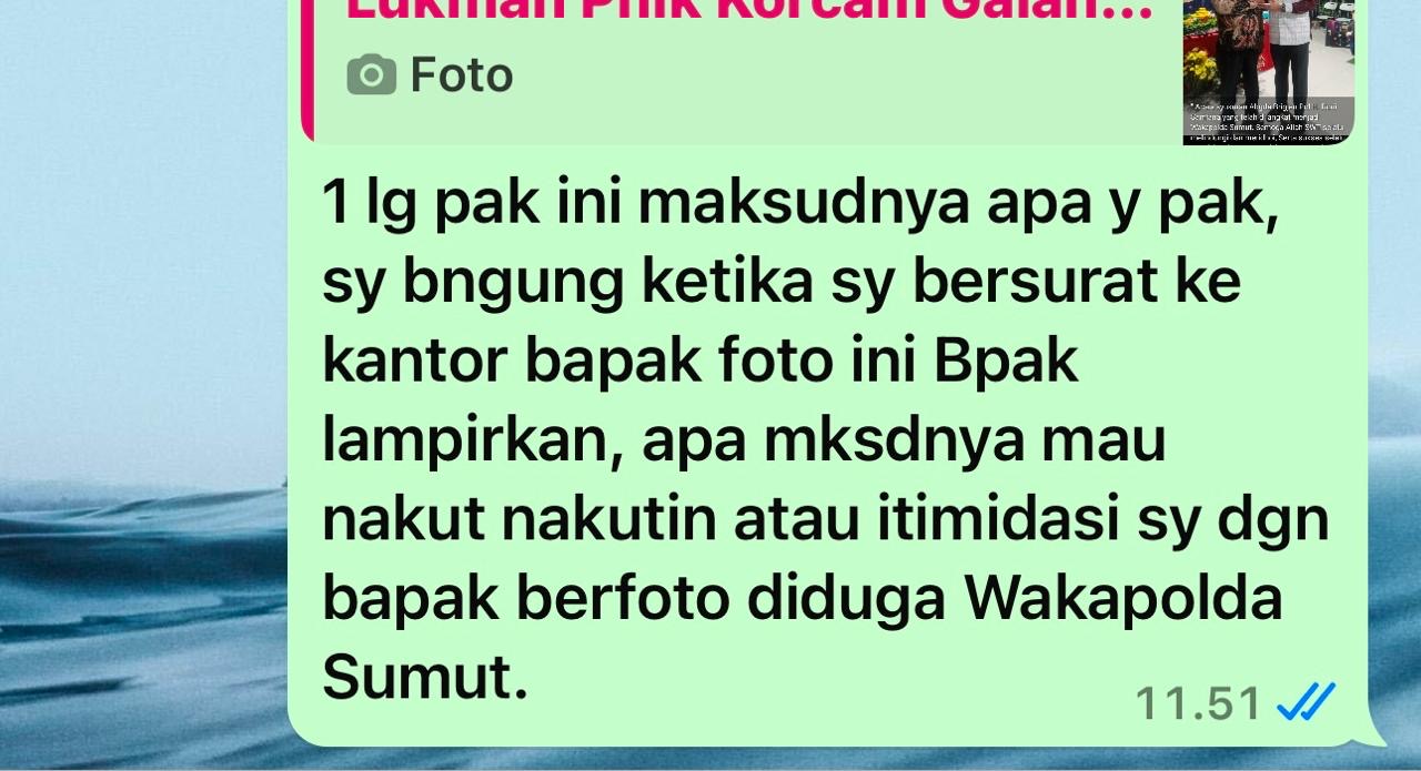 “Pak ini maksudnya apa y pak, sy bngung ketika sy bersurat ke kantor bapak foto ini Bpak lampirkan, apa mksdnya mau nakut nakutin atau itimidasi sy dgn bapak berfoto diduga Wakapolda Sumut” Balas Fika melalui pesan tersebut.
