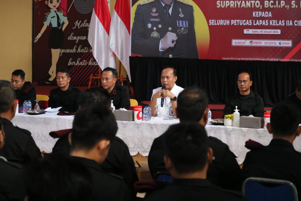 DELIK-HUKUM.ID (CIBINONG) — Direktur Pengamanan dan Intelijen Direktorat Jenderal Pemasyarakatan, Supriyanto memberikan pengarahan dan Penguatan Tugas dan Fungsi Pemasyarakatan kepada seluruh Petugas Lapas Cibinong bertempat di Aula Saharjo, Sabtu (6/1/2024).