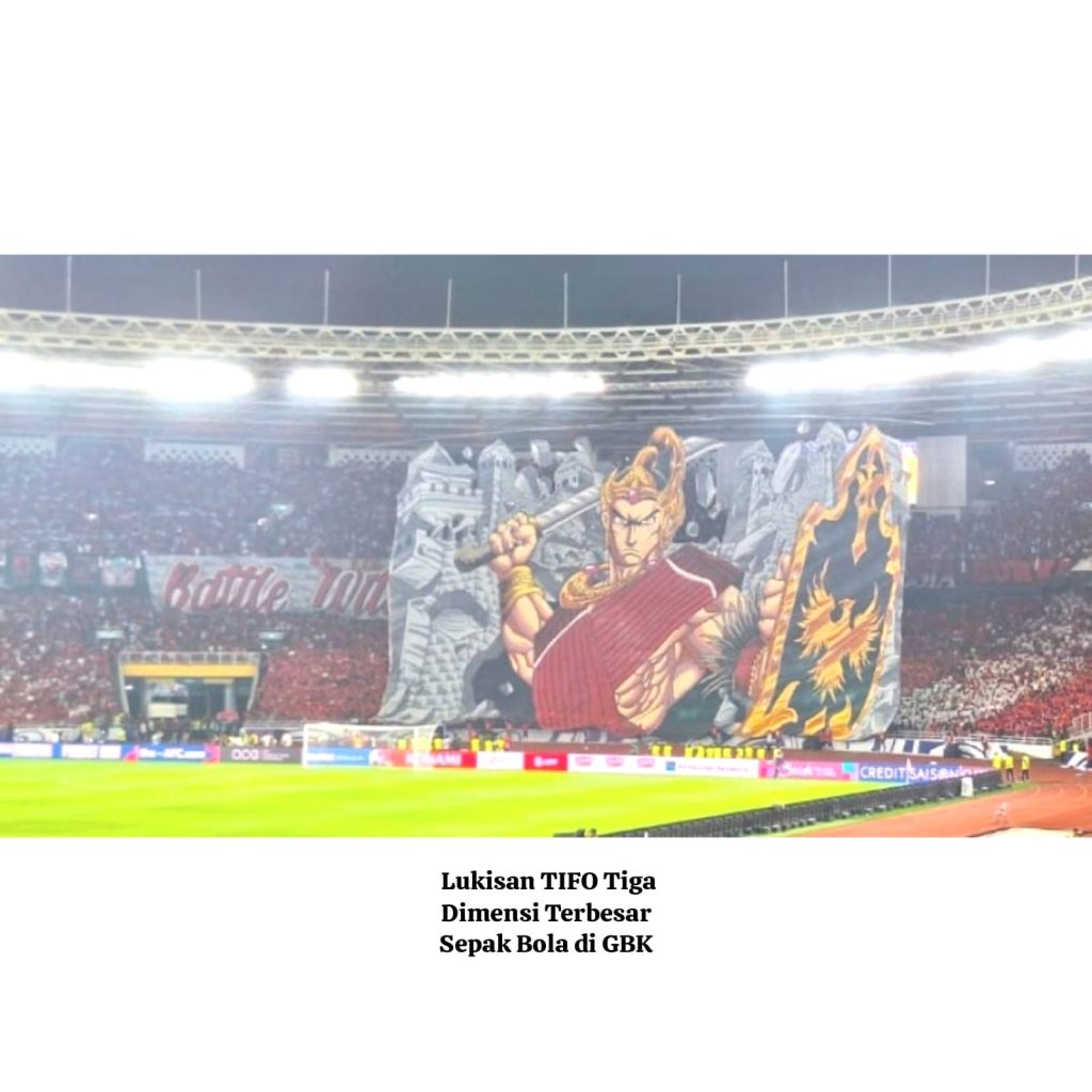 DELIK-HUKUM.ID ( JAKARTA ) — Bukti dari kolaborasi sebanyak 25 seniman lokal dan komunitas La Grande, itu menghasilkan tifo yang monumental lukisan tangan raksasa bergambar pejuang Nusantara yang berkibar di tribun utama GBK.