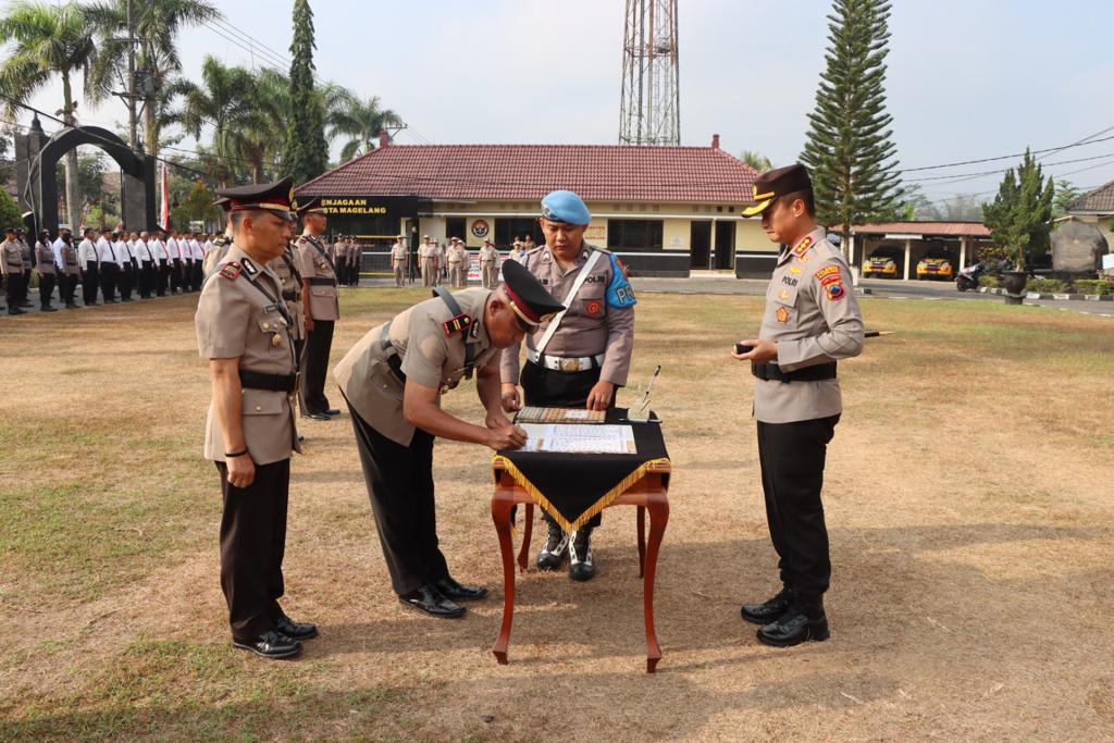 Upacara Sertijab berlangsung di Halaman Depan Mapolresta Magelang pada Selasa (29/08/2023) pagi. Dihadiri oleh Ibu Ketua Bhayangkari Cabang Kota Magelang beserta Pengurus, Wakapolresta Magelang, para Kabag, para Kasat, para Kapolsek Jajaran, para Perwira Staf dan Bintara serta PNS Polresta Magelang.