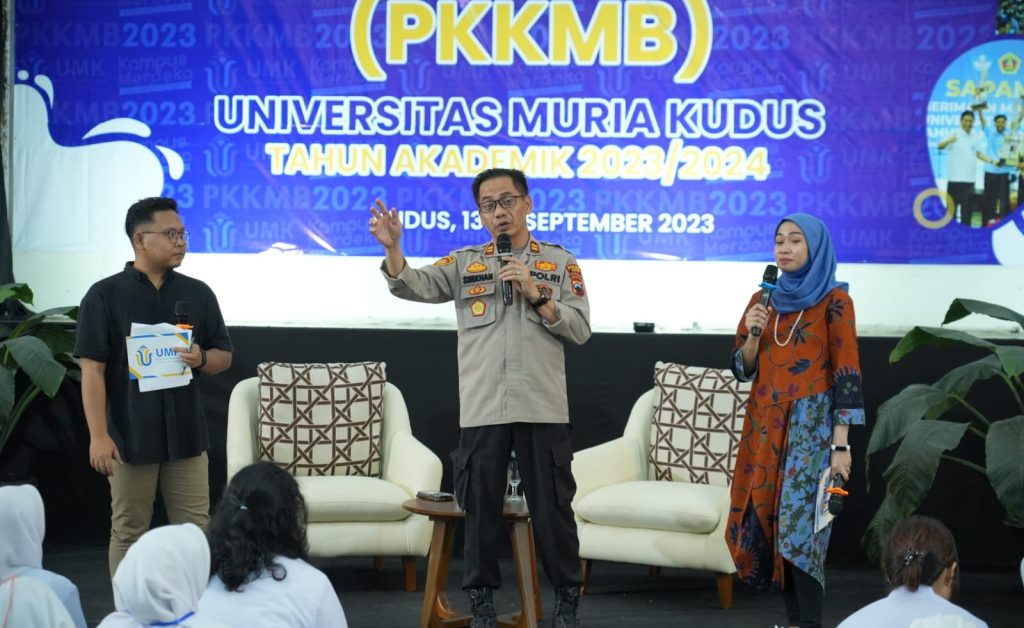 KUDUS – Kapolsek Kudus Iptu Subkhan kembali menjadi pembicara dalam Pengenalan Kehidupan Kampus bagi Mahasiswa Baru (PKKMB) di Universitas Muria Kudus (UMK). Kegiatan berlangsung di Gedung Auditorium kampus setempat, Jumat (15/09/2023).