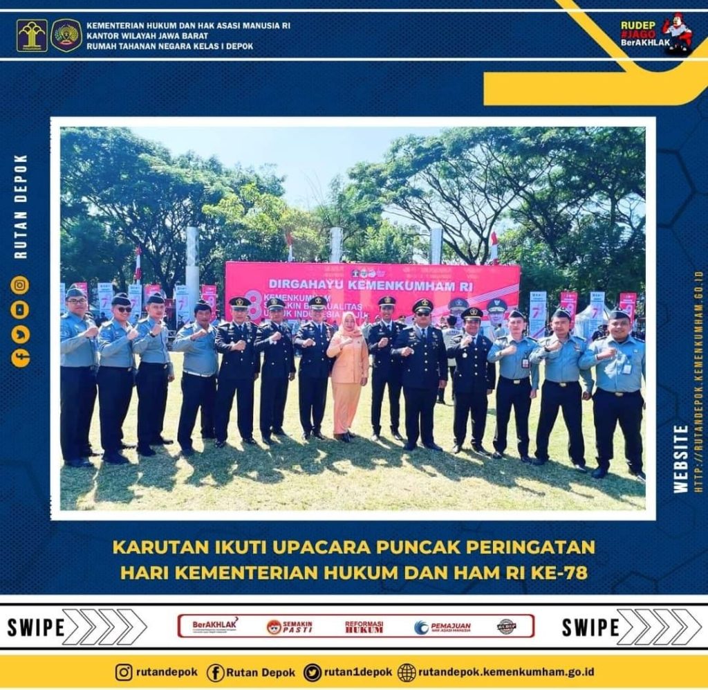 Bandung,DELIK – HUKUM.ID – Kepala Rutan Kelas I Depok, Andi Gunawan, menghadiri Upacara Puncak Peringatan Hari Kementrian Hukum dan HAM R.I (Hari Dharma Karya Dhika/ HDKD) Ke-78 yang digelar di Lapangan Gasibu Kota Bandung pada tanggal 21 Agustus 2023. Upacara Hari Kemenkumham Tahun 2023 di Jawa Barat ini melibatkan sebanyak kurang lebih 2.050 orang terdiri dari seluruh Pegawai Kanwil Kemenkumham Jabar dan Perwakilan Unit Pelaksana Teknis Pemasyarakatan dan Imigrasi se-Jawa Barat dan Taruna Poltekip dan Poltekim, Polda Jawa Barat, Kodam III/ Siliwangi, Forkopimda Provinsi Jawa Barat, Satpol PP Kota Bandung, Dinas Kebakaran Jabar, Notaris, Permahi, Forum Pelajar Sadar Hukum, Yayasan Air. Turut hadir, Pinisepuh Pengayoman, Stakeholder dan Tamu Undangan lainnya.