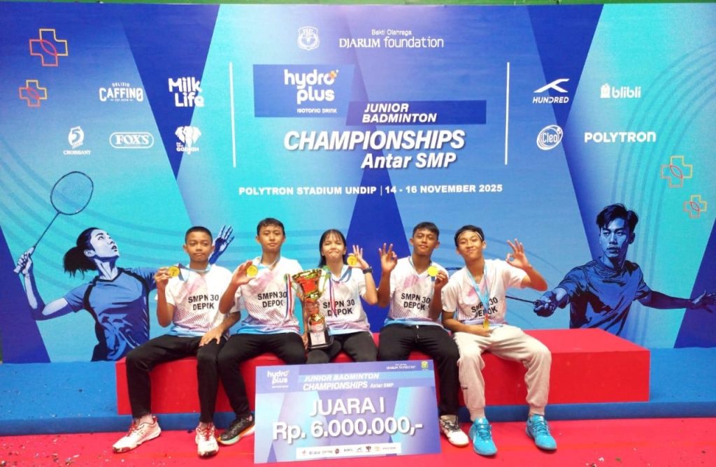 Hal itu, dilakukan tim bulutangkis SMPN 30 Kota Depok sukses menjadi yang terbaik di Kejuaraan Bulutangkis Beregu Antar SMP HydroPlus Badminton Championships 2025 yang berlangsung di Polytron Stadium Universitas Diponegoro, Semarang, Jawa Tengah (Jateng)14-16 November.