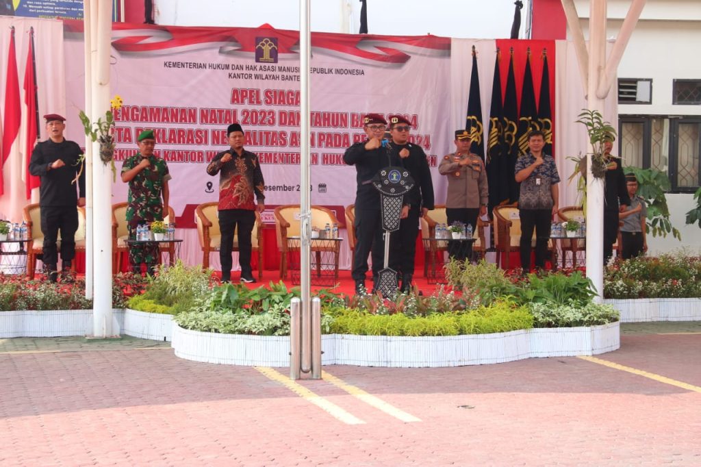 Dalam sambutannya, Kepala Kantor Wilayah (Kakanwil) Banten, Dodot Adikoeswanto menyampaikan Apel Siaga Natal 2023 dan Tahun Baru 2024 ini merupakan tindaklanjut atas Surat Edaran Direktur Jenderal Pemasyarakatan Nomor PAS-2077.PK.08.05 Tanggal 29 November 2023.