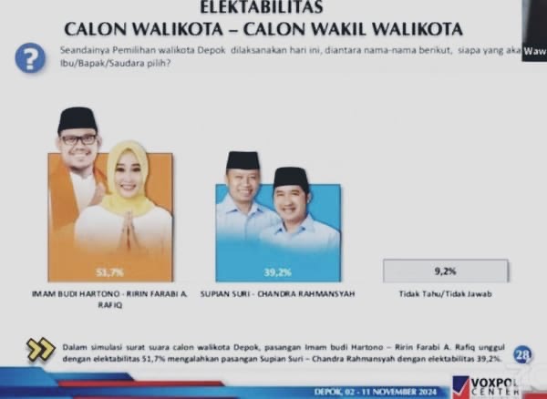 Dari hasil survei Voxpol Center Research and Consulting, paslon nomor urut 1 Imam Budi Hartono-Ririn Farabi Arafiq (Imam-Ririn) unggul elektabilitas 51,7 persen banding elektabilitas Supian Suri-Chandra Rahmansyah (Supian-Chandra) 39,2 persen jelang pencoblosan Pilkda Depok, 27 November 2024.