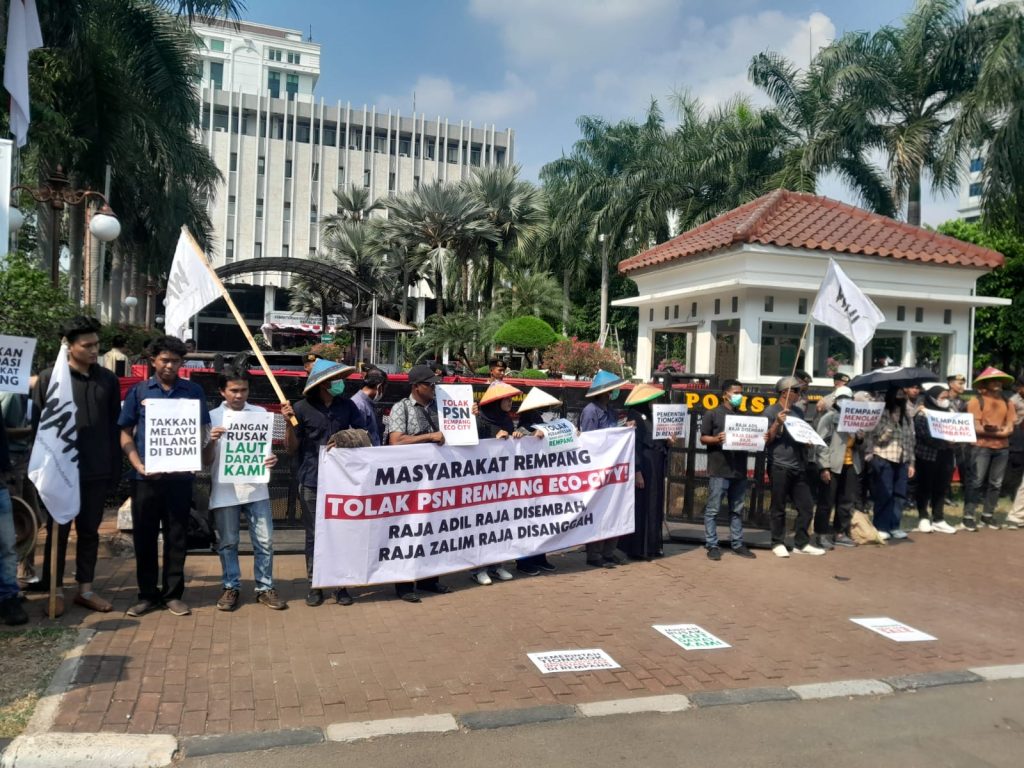 Masyarakat berorasi, menyatakan sikap tegas mereka menolak penggusuran akibat rencana pemerintah membangun Proyek Strategis Nasional (PSN) Rempang Eco City. Mereka membawa spanduk berisi tulian “Masyarakat Rempang Tolak PSN Rempang Eco City, Raja Adil Raja Disembah Raja Zalim Raja Disanggah”. Mereka juga sertakan perjuangan mereka mempertahankan ruang hidupnya dengan spanduk bertuliskan semangat mempertahankan kampung yang telah mereka diami turun temurun sejak ratusan tahun lalu.