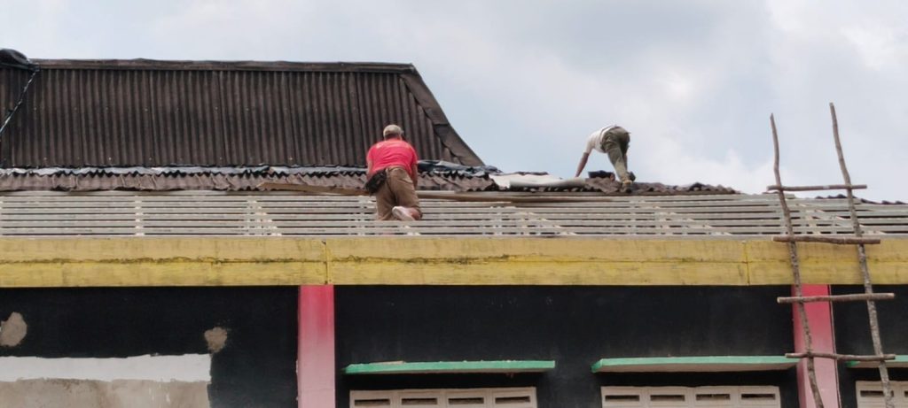 Bahkan para pekerja ini terlihat tanpa menggunakan alas kaki. Padahal mereka terlihat berdiri di penyangga atap. Bahkan beberapa kali pekerja berdiri dan berpindah memperbaiki dan membuka atap Gedung yang akan di ganti.