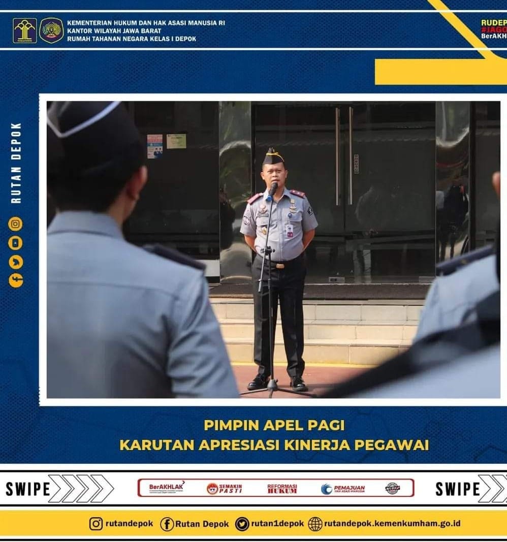 Depok, DELIK – HUMUM.ID— Pagi yang cerah pada tanggal 11 September 2023, bertempat di Lapangan Upacara Rutan Kelas I Depok dilaksanakan kegiatan Apel Pagi Pegawai, kegiatan ini dipimpin oleh Kepala Rutan Kelas I Depok, Andi Gunawan, dihadiri oleh jajaran Pejabat Struktural, serta Pegawai dari JFU (Jabatan Fungsional Umum) dan JFT (Jabatan Fungsional Tertentu).