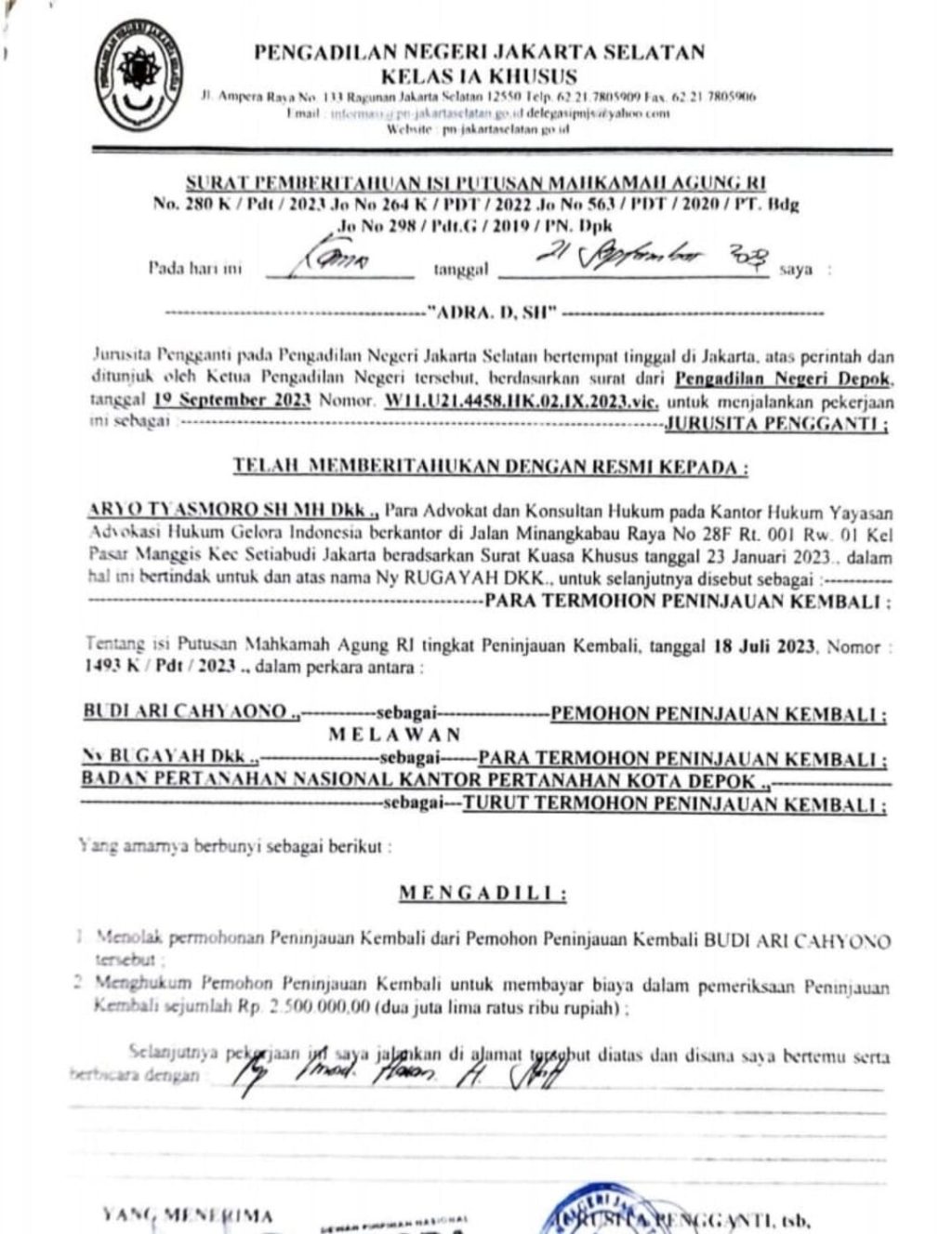 Dan sekarang pihak MA sudah mengeluarkan keputusannya kembali bahwa PK sdr Budi di tolak MA dan Keputusan ini tertuang dalam surat Pemberitahuan Putusan Mahkamah Agung RI No 280K/Pdt/2023 Jo No 264K/Pdt/2022 Jo No 563/Pdt/2020/PT Bdg Jo No 298/Pdt G/2019/PN Depok yg berisi MENOLAK Kasasi sdr. Budi.
