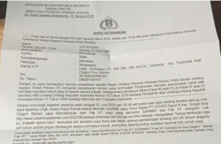 ‘”Saya selaku korban sudah ke polda Banten, semoga Bapak Kapolda Banten melalui Direktur Kriminal Khusus dan jajarannya terkait dugaan tindak pidana ITE mengenai penyebaran konten yang bermuatan penghinaan dan/atau pencemaran nama baik dan/atau menakut-nakuti yang di tujukan secara pribadi, dapat membuka fakat kebenaran melalui Proses Hukum, “tegas Vivi Penuh tegar.