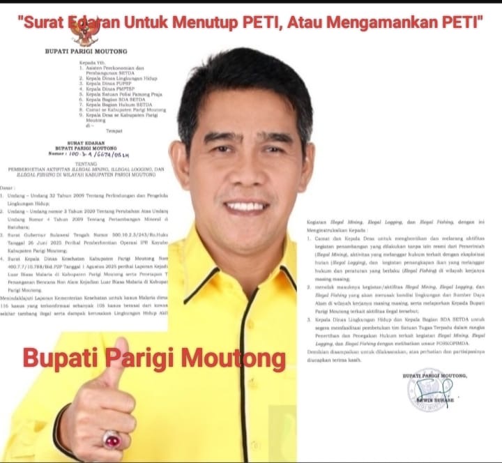 Bupati Parimo, Erwin Burase, yang baru dilantik pada tanggal 2/6/2025 itu, langsung mengambil tindakan, dengan mengeluarkan Surat Edaran, [SE], Nomor ; 100. 3. 4/6674/DIS LH Tentang ; Pemberhentian Aktifitas Illegal Mining, Illegal Logging, dan Illegal Fishing di Wilayah Kabupaten Parigi Moutong.