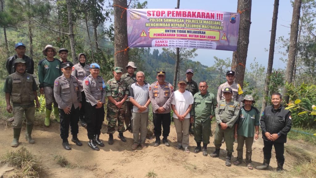 Polresta Magelang-Polda Jawa Tengah – Sebuah upaya melindungi alam berupa Sosialisasi Pencegahan Kebakaran Hutan dan Lahan (Karhutla) dan pemasangan banner peringatan dilakukan Polsek Sawangan dan beberapa pihak terkait. Kegiatan digelar di Bumi Perkemahan Sobleman dan Jalur Pendakian Suwanting, Desa Banyuroto, Kecamatan Sawangan, Kabupaten Magelang, Jumat (29/09/2023) pagi.