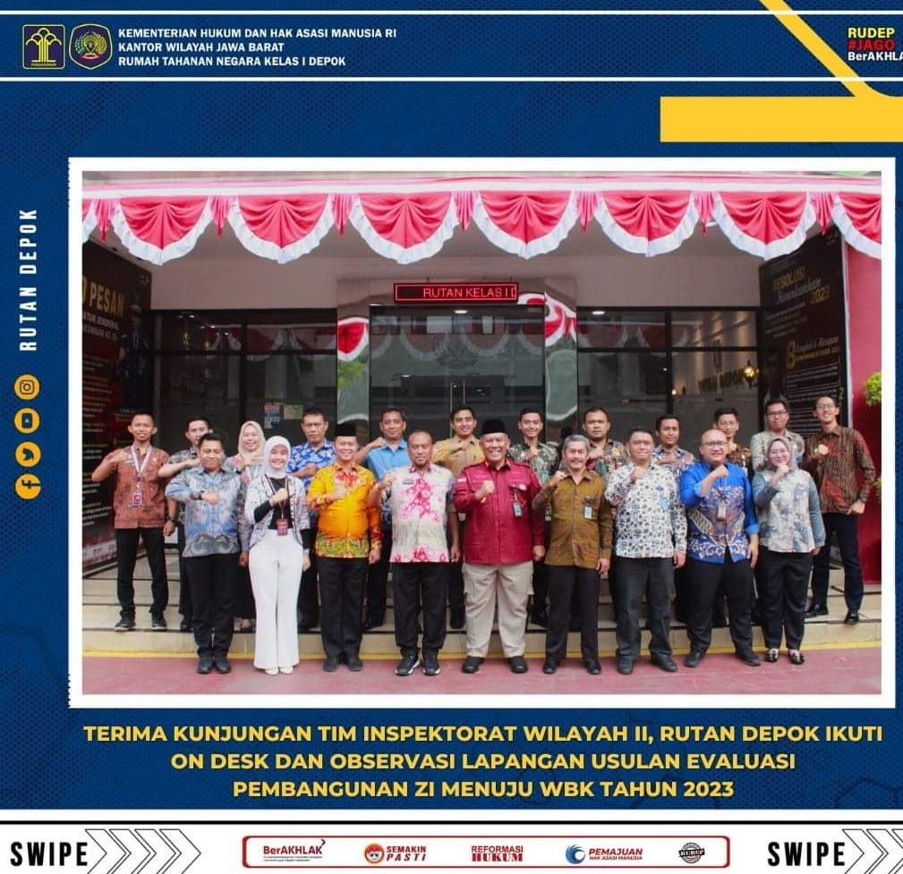 Pasca beberapa bulan sebelumnya Tim Inspektorat telah melakukan Desk Evaluasi Pembangunan Zona Integritas Menuju Wilayah Bebas dari Korupsi (WBK) di Rutan Kelas I Depok, namun pada hari ini Tim Inspektorat melakukan On Desk dan Observasi atau verivikasi Lapangan Usulan Evaluasi Pembangunan ZI menuju WBK, dalam momen ini pula turut hadir secara langsung Inspektur Wilayah IV, Bambang Setyabudi dengan didampingi Kepala Kantor Wilayah Kementerian Hukum dan HAM Jawa Barat, R. Andika Dwi Prasetya.