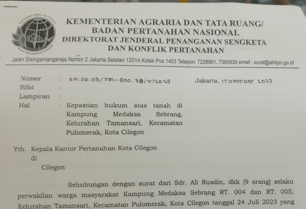 Adapun dalam uraian surat tersebut, kata Aris bahwa kepastian hukum atas tanah Kampung medaksa sebrang, Kelurahan Tamansari Kecamatan pulomerak, Kota Cilegon, BERUPA SURAT tanggal 17 Oktober 2023 langsung dari Kementerian ATR/BPN melalui Direktorat Jenderal Penanganan Sengketa dan Konflik Pertanahan yang ditujukan kepada Kepala Kantor Pertanahan Kota Cilegon.